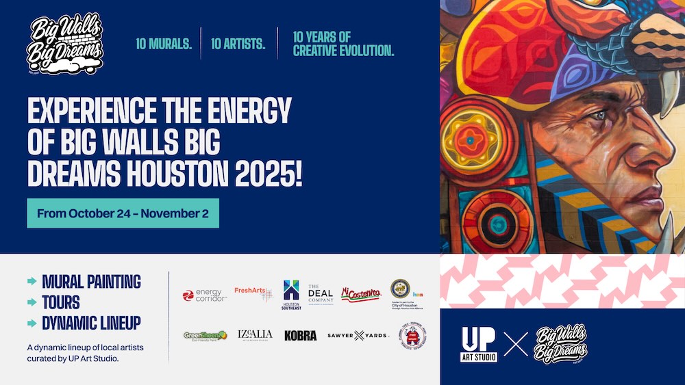Welcome to the vibrant Big Walls Big Dreams Houston 2025 mural-painting festival. This October-November in Houston, a group of local and national artists, curated by UP Art Studio, will simultaneously paint large-scale murals in communities throughout the city.
