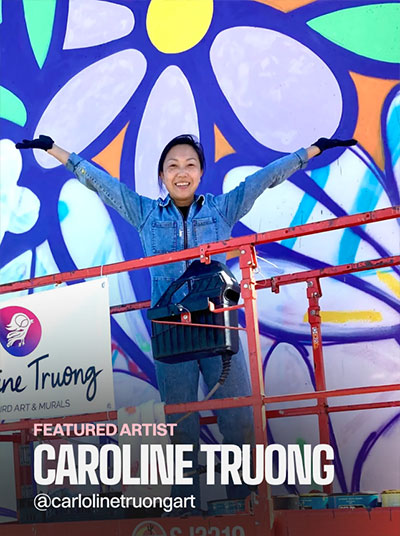 Vietnamese-American artist Caroline Truong paints joyful, floral worlds that blend illustration and fine art. Her signature character Dream Bird and playful color palettes embody optimism and imagination. Through her murals, Truong invites viewers into spaces where creativity blossoms and community care takes flight.