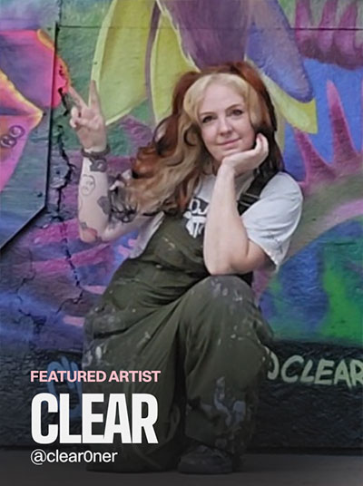Clear merges the raw energy of graffiti with the organic calm of nature. Since 2012, her large-scale murals have transformed walls into living stories of color and motion. Balancing precision and spontaneity, Clear’s art offers viewers a moment of reflection amid the movement of the city.