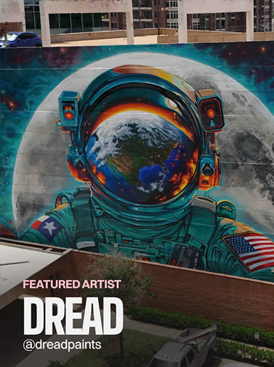 Robin Munro, known as Dread, is a nationally recognized muralist, curator, and founder of CRUSH Walls in Denver, CO. With 25 years of creative experience, his work spans murals, sculpture, and large-scale production. Now based in Houston, Dread blends street culture and fine art into vivid worlds that inspire reflection and wonder.