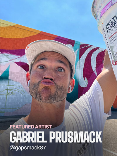 Gabriel “GapSmack” Prusmack explores identity, color, and rhythm through contrast and abstraction. His murals pulse with joy and movement, blending semi-realism and graffiti influence to capture moments of freedom and connection. Each piece reflects his belief in creativity as an act of joy and self-discovery.